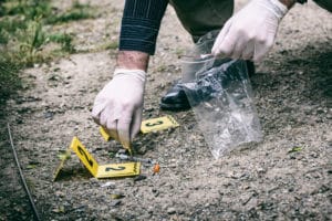 Crime scene investigation, picking up the tossed syringe and putting it to the plastic bag